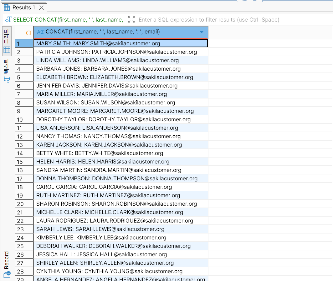 고객 이름 + 이메일을 하나의 문자열로 결합:
