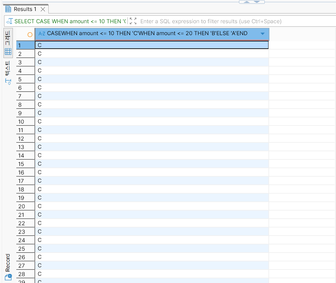 결제 금액 구간(예: 0~10, 10~20 등)을 CASE로 구분한 등급 컬럼: