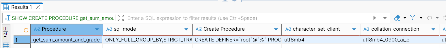 get_sum_amount_and_grade 프로시저의 정의를 조회한다.