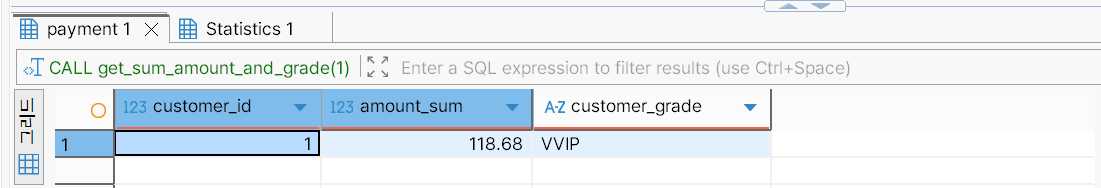 CALL get_sum_amount_and_grade(1);