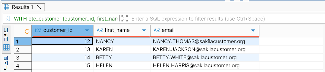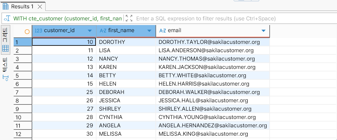 다음은 customer 테이블에서 customer_id 열의 값이 10 이상 100 미만인 행을 선택해 논리적 테이블을 생성한다. 그리고 해당 테이블의 모든 데이터를 조회한다.