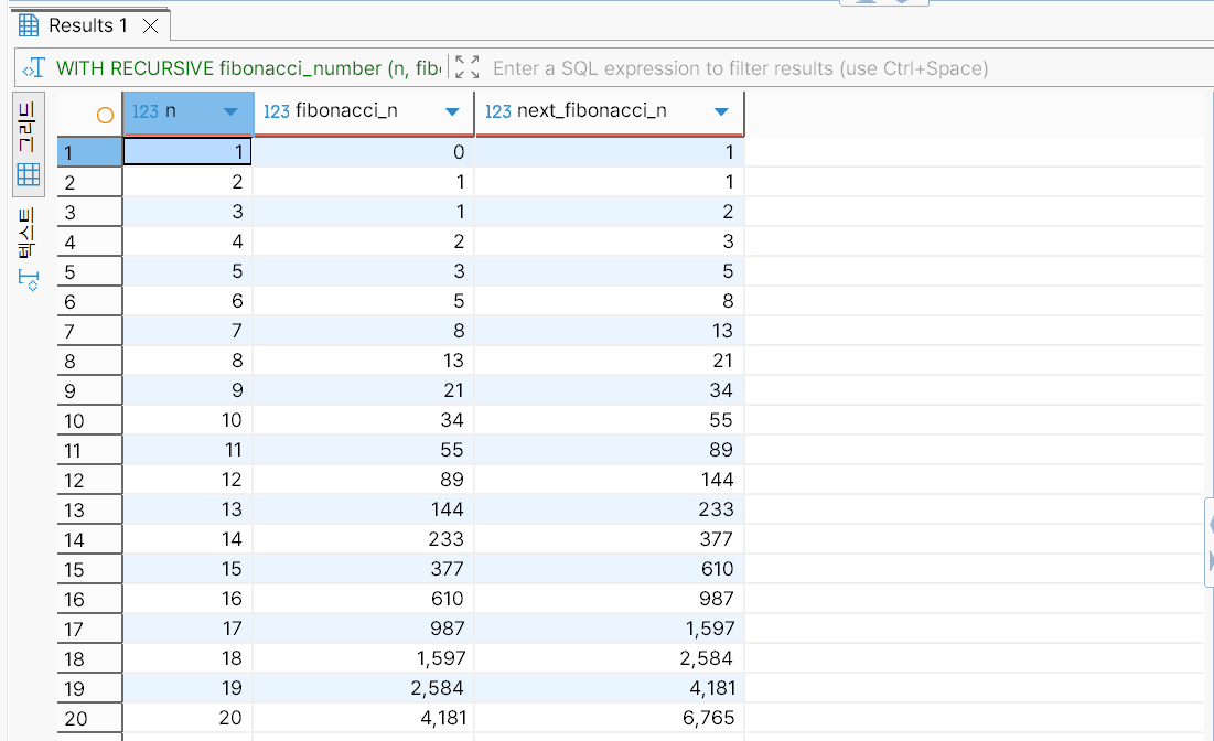 WHERE 절의 n < 20 조건을 n < 10으로 바꾼 뒤 실행한 결과는 다음과 같다. 반복이 10회 감소함에 따라 행의 개수도 10개 감소했다.