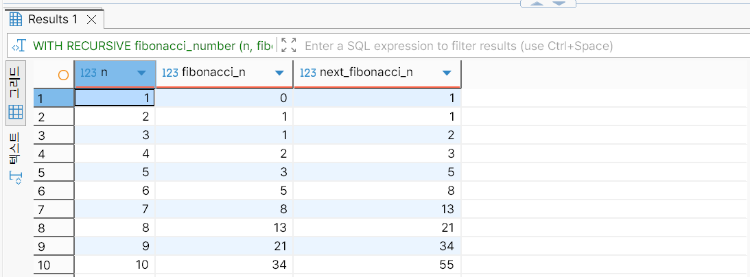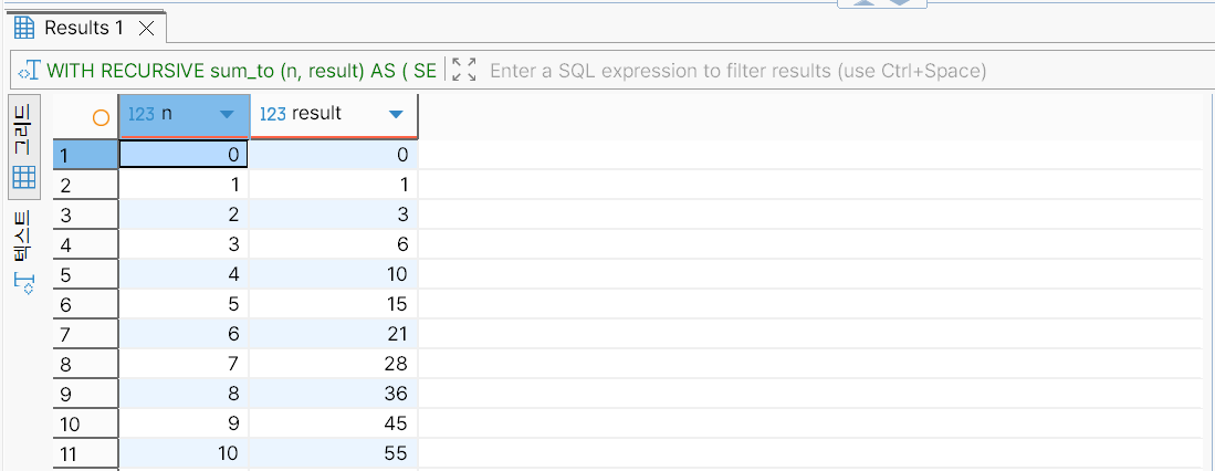 1부터 10까지의 합을 구하는 재귀 CTE를 사용해 작성한 SQL 문은 다음과 같다.