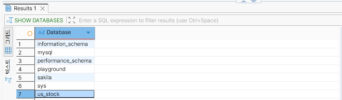 us_stock 데이터베이스가 생성되었는지 확인한다.