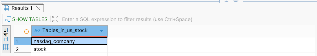 nasdaq_company 테이블과 stock 테이블이 생성되었는지 확인한다.