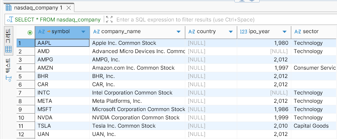 일련의 INSERT 문 실행 후 nasdaq_company 테이블에 데이터가 삽입되었는지 확인한다.