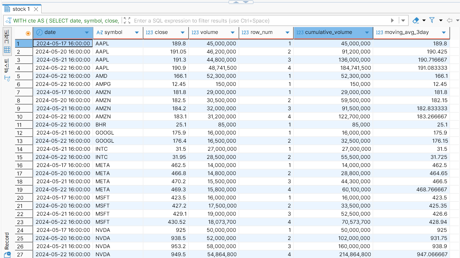 다음은 stock 테이블에 대한 분석 쿼리를 작성한 것이다. CTE와 윈도우 함수(ROW_NUMBER, SUM, AVG 등)를 활용하였다.