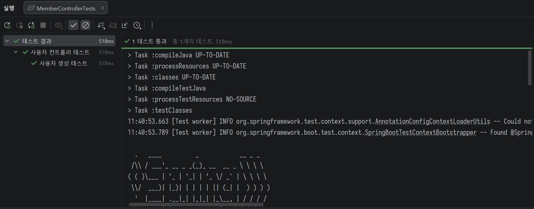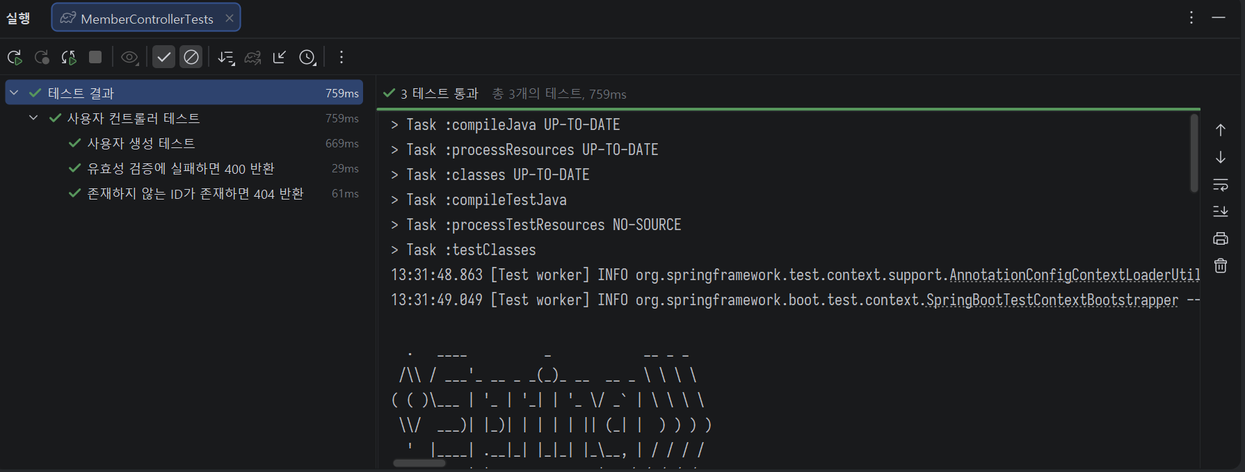 }MemberControllerTests 테스트를 실행한 결과는 다음과 같다.