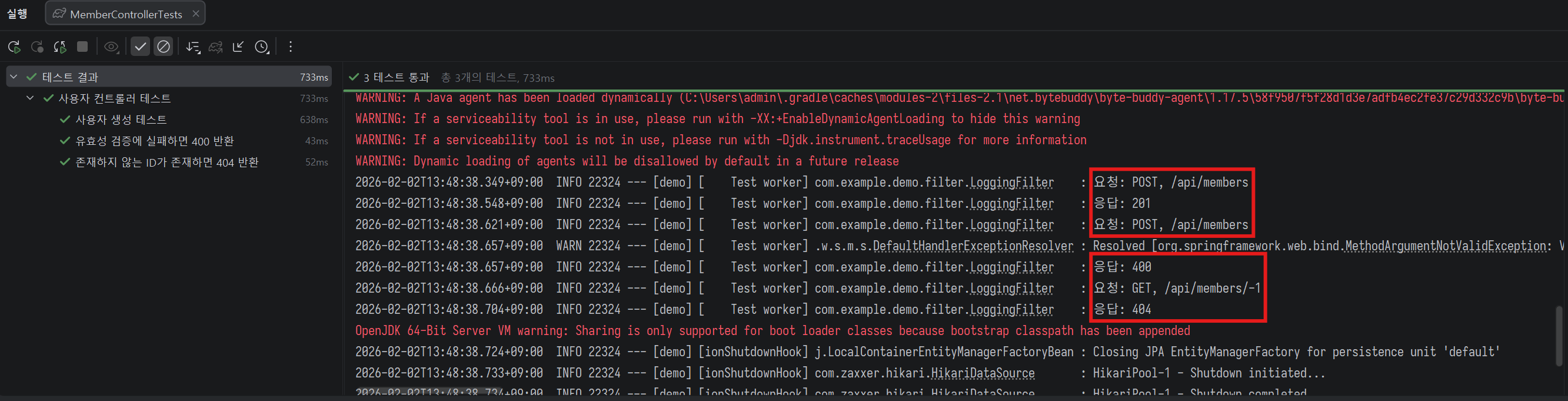 MemberControllerTests 테스트를 수행한다. 로깅 필터가 동작하여 테스트 로그에 기록된 것을 확인할 수 있다.